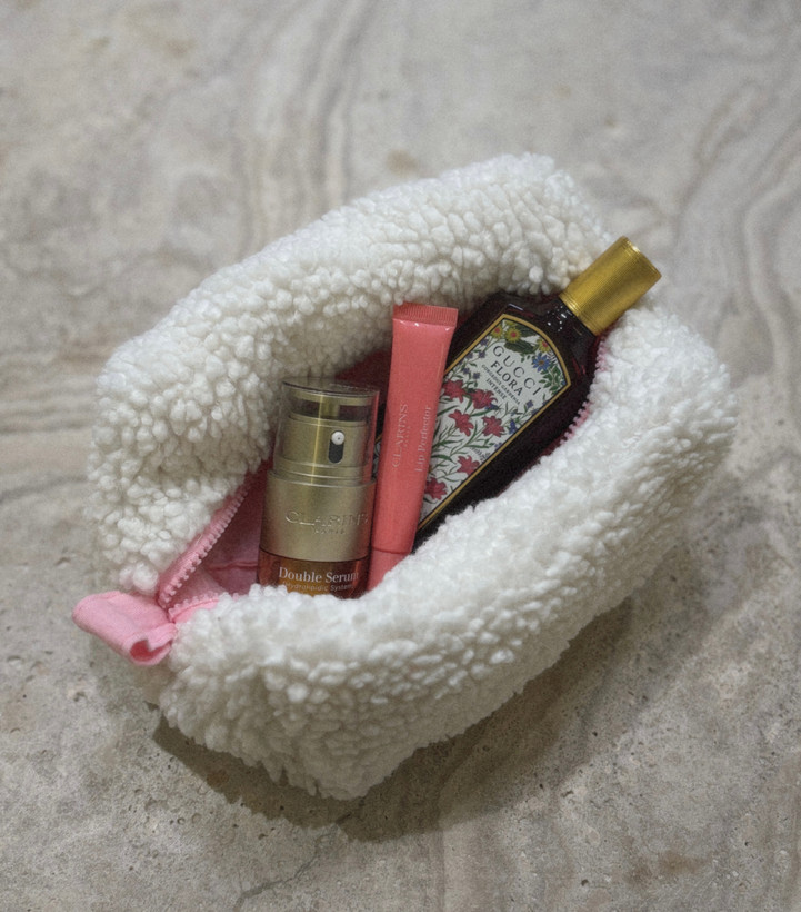 کیف سفید تدی با زیپ صورتی، قابل شستشو مناسب برای لوازم ارایش و جامدادی، داخل کار صورتی کار شده
